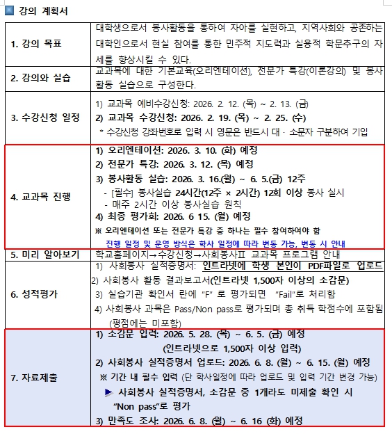 2026학년도 1학기 사회봉사 교과목 (사회봉사I) 운영계획 및 수강신청 안내
